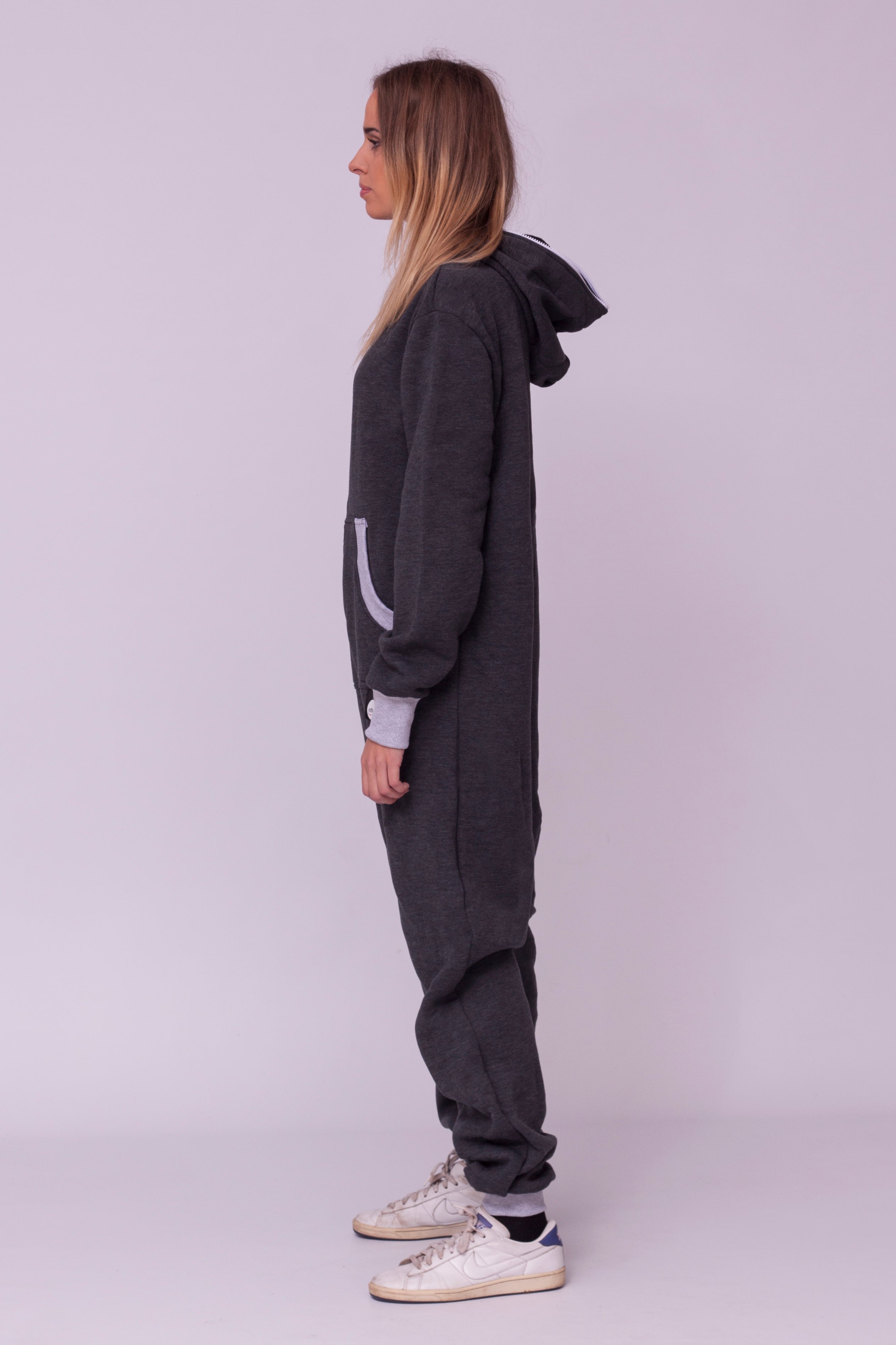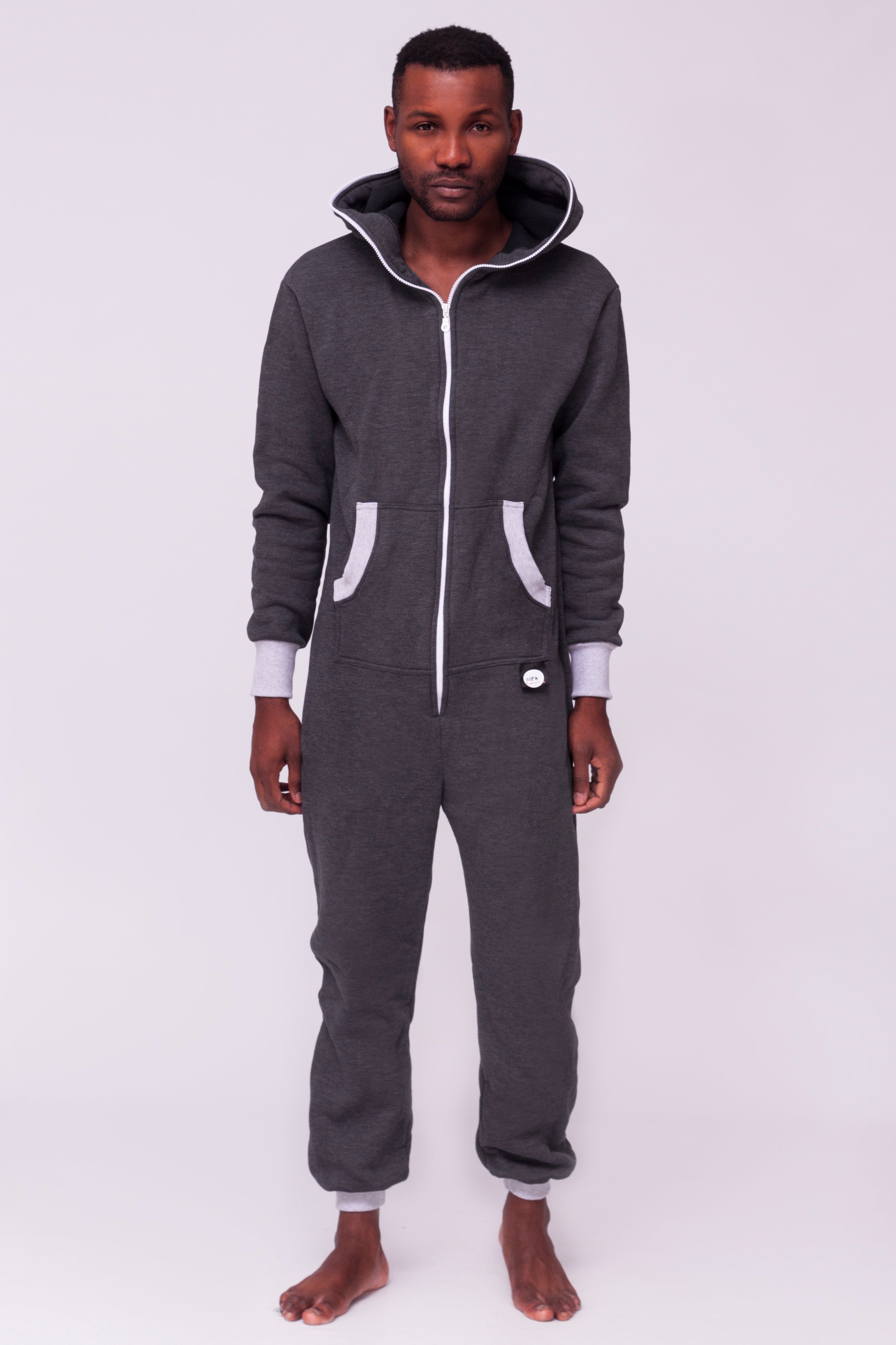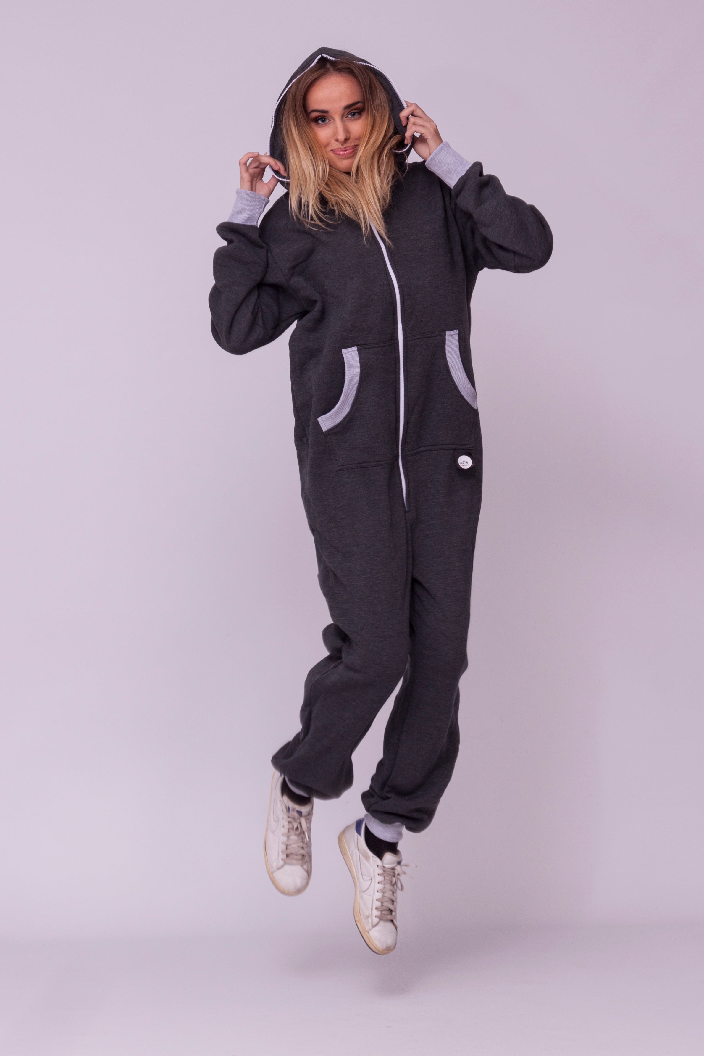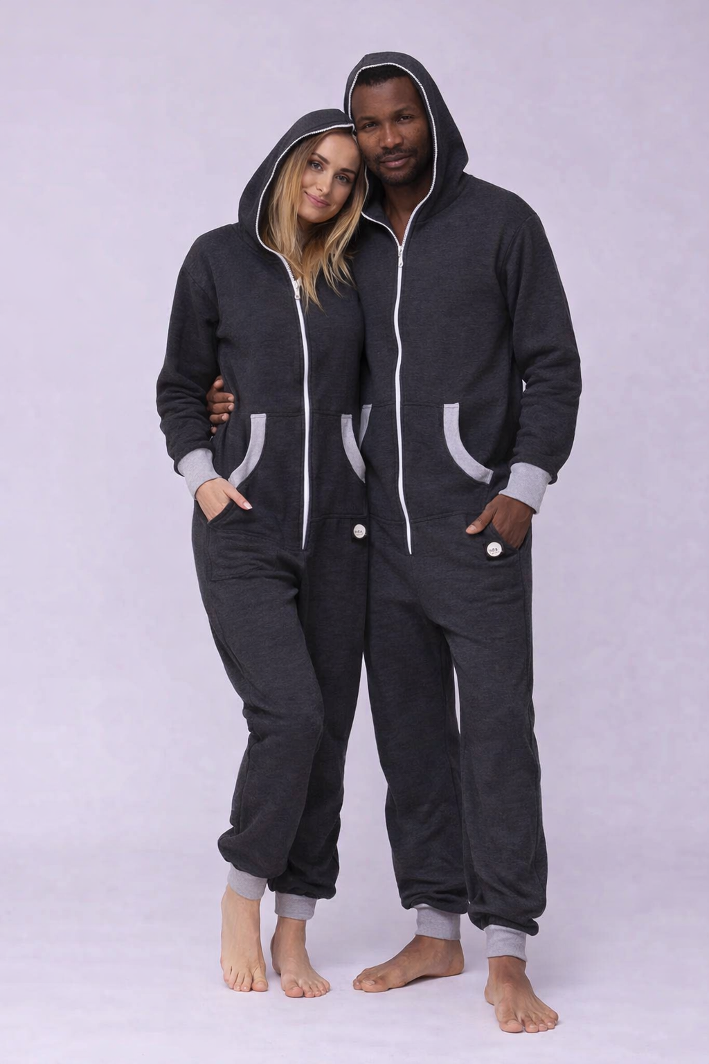 A subtle contrast design featuring dark grey fabric with light grey cuffs. This matching couple jumpsuit balances comfort and modern style.
